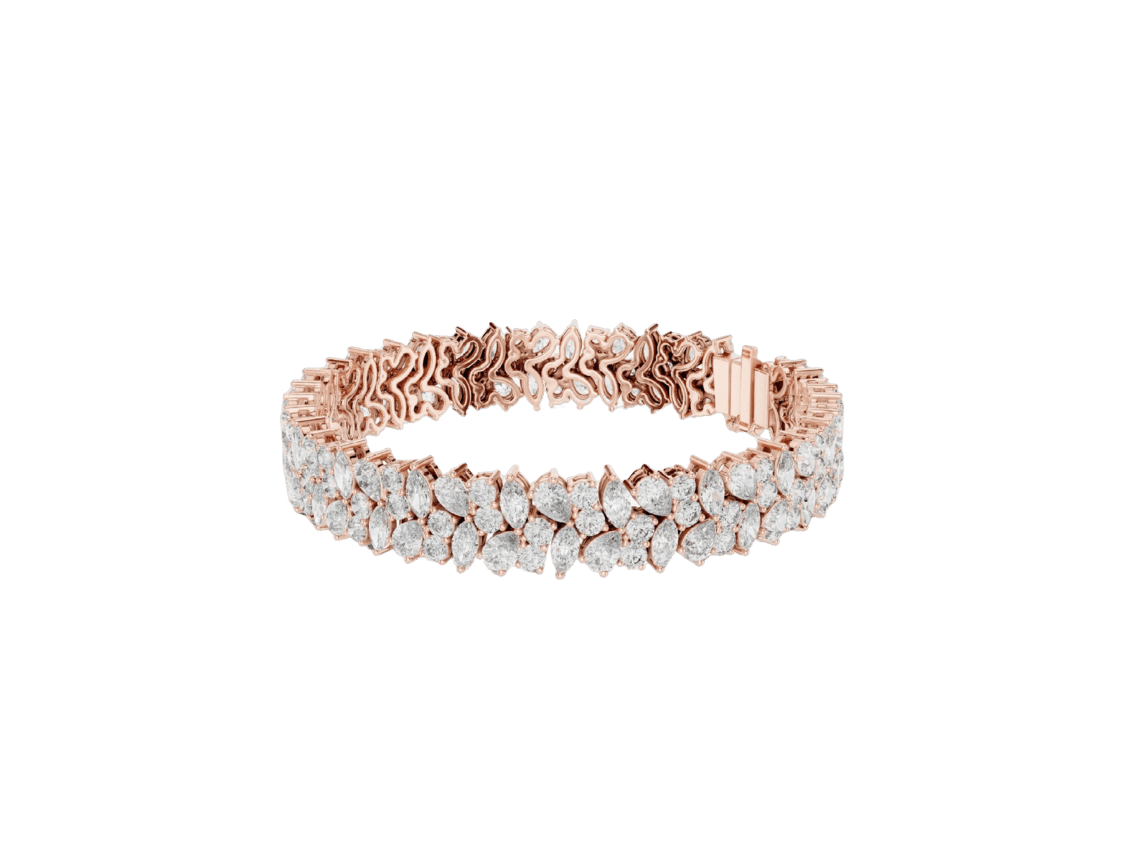 A wider rose gold bracelet featuring multiple rows of dazzling diamonds for maximum sparkle.