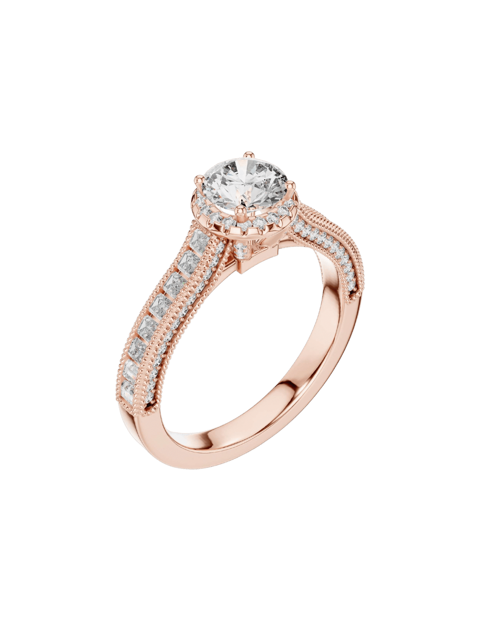 A beautiful rose gold ring featuring a sparkling central diamond atop a unique intertwined and diamond-accented band.