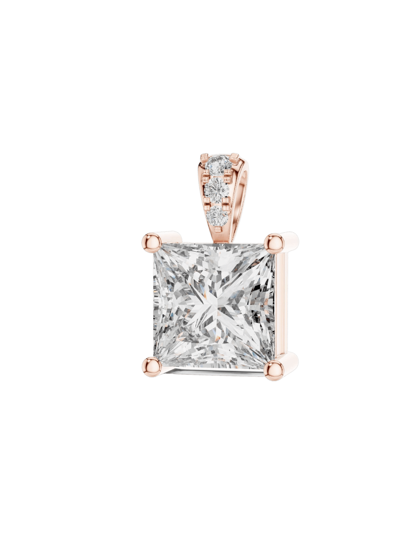 A stunning rose gold pendant featuring a square-cut diamond framed by a brilliant pavé halo.