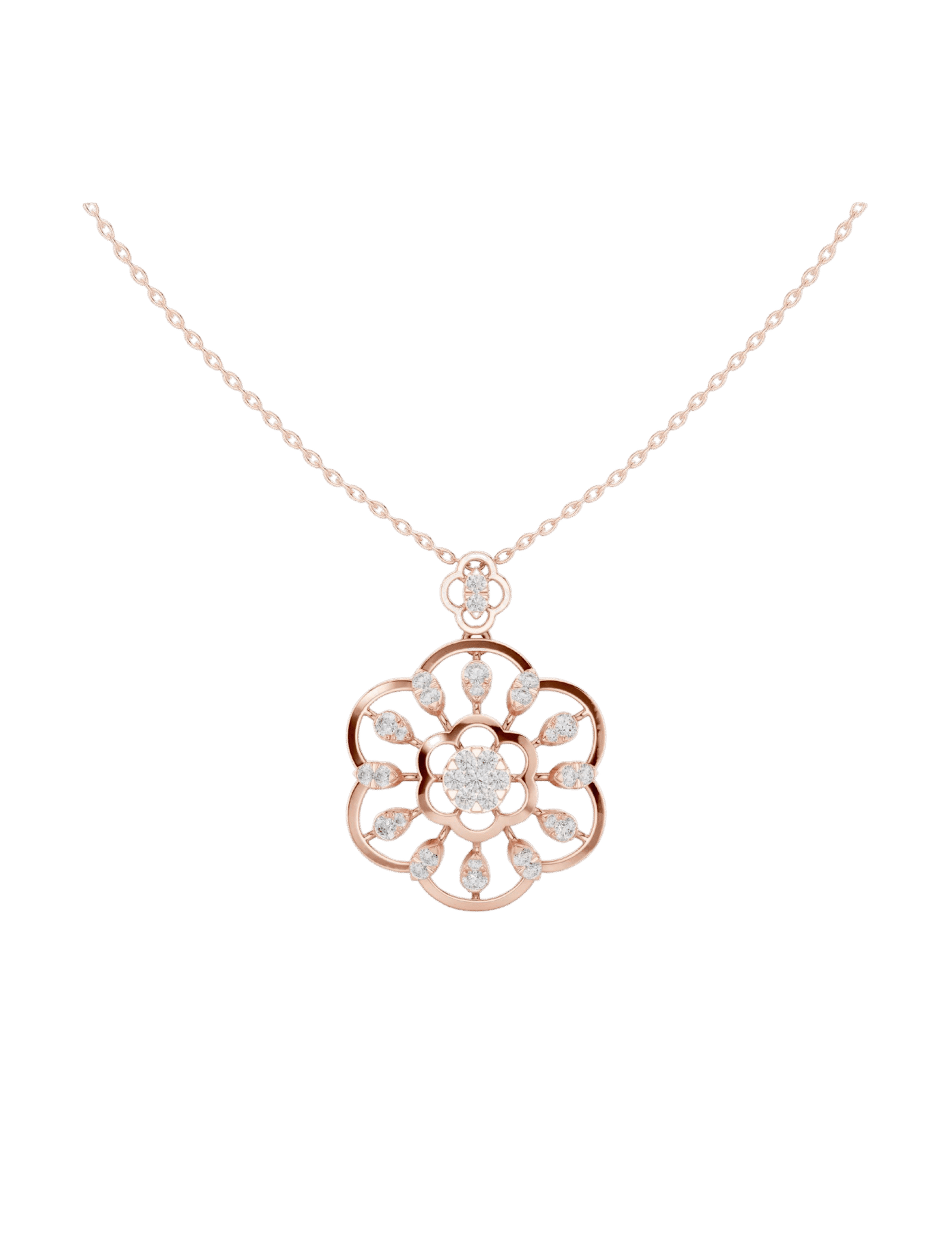 An elegant rose gold floral or abstract pendant showcasing a delicate openwork design with sparkling diamonds.